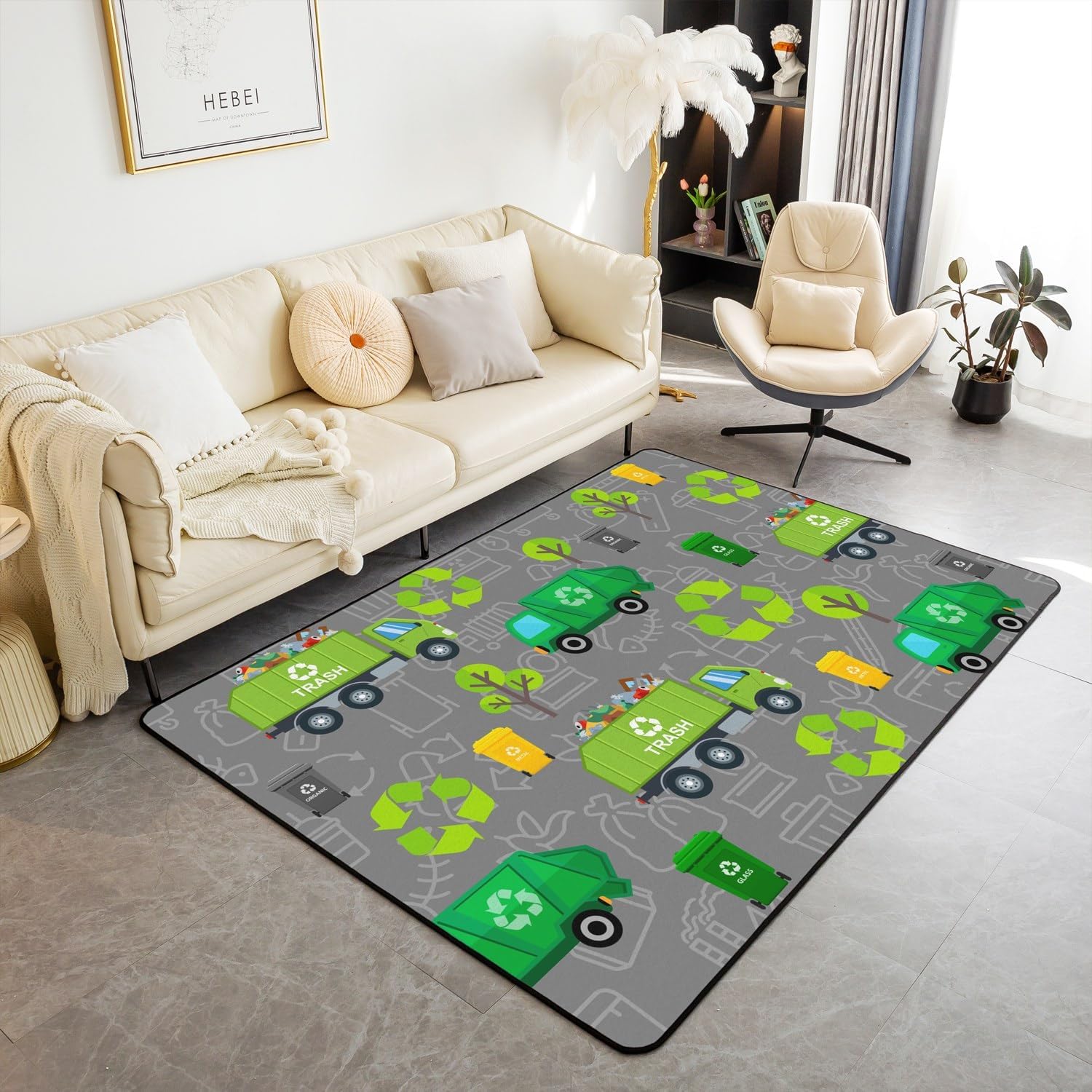 No garbage truck-themed kids bedroom is complete without a bold area rug. A rug featuring roads, trash cans, and trucks creates the perfect play space while tying the whole theme together. Not only does it add garbage truck decor underfoot, but it also sparks endless imaginative play with toy vehicles.