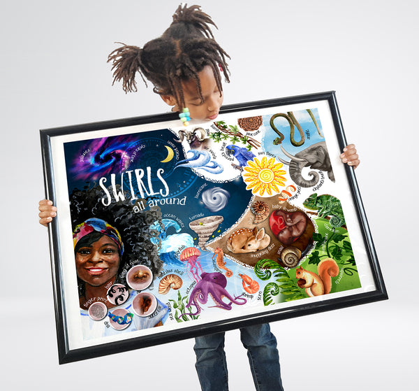 With our poster “Swirls all around” you can take a new look at the amazingness of black natural hair texture. See how its shape continues through creation.